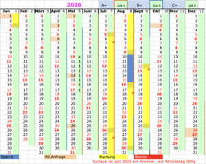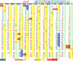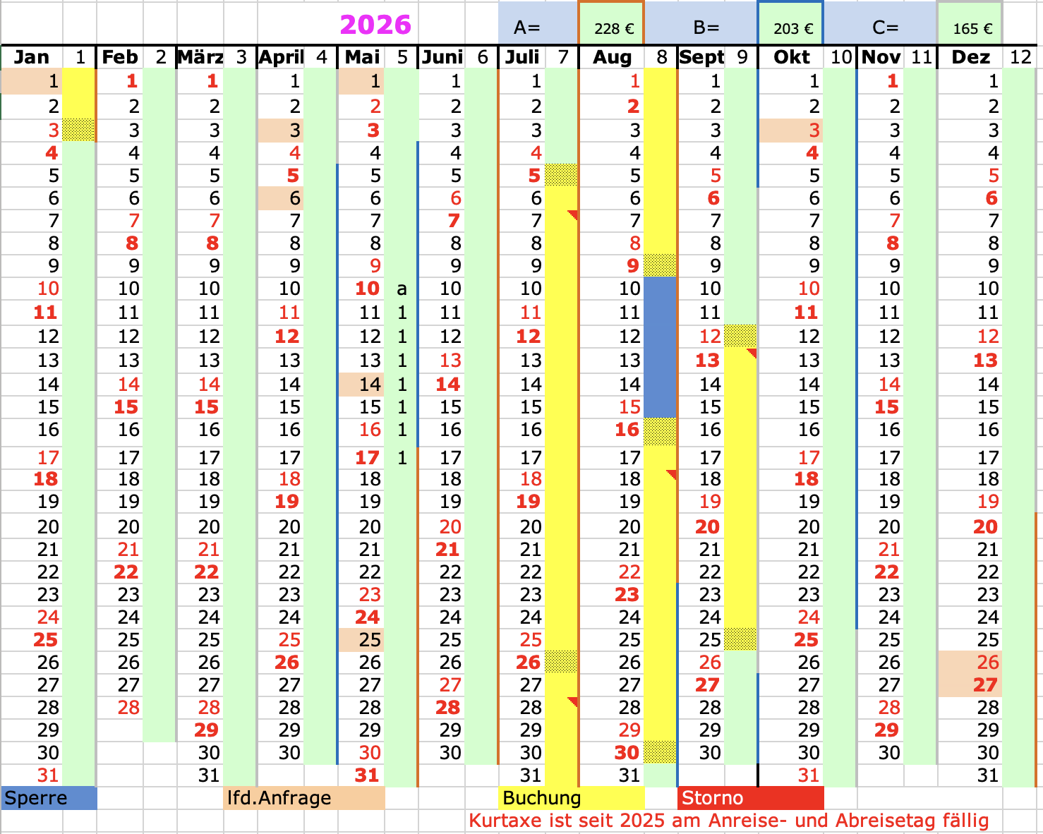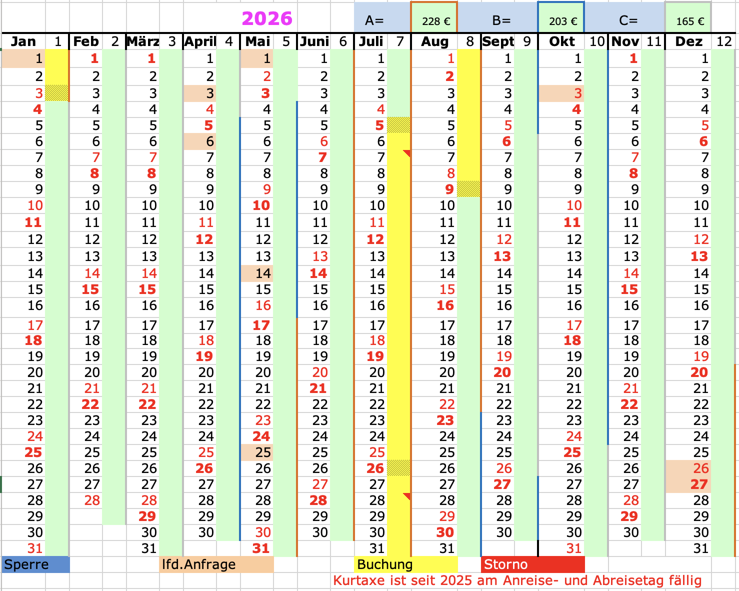 Buchungskalender - bitte anklicken zur besseren Lesbarkeit - die gelben Zeiten sind belegt. Schraffiert An- oder Abreisetag.